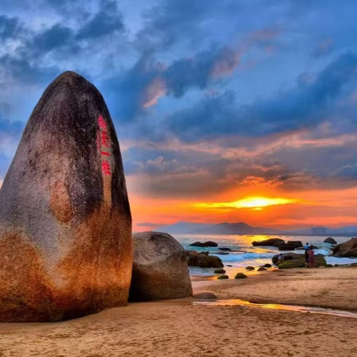 Legend has it that long ago, a young couple from a distant land fell deeply in love since childhood. However, their families did not approve of their relationship, and so they fled to Hainan Island, to Sanya. Facing the vast ocean ahead and their pursuers behind, they saw no escape and embraced as they ran towards the sea. At that moment, a thunderstorm erupted, and with a loud crash, everyone turned into stones. It is said that the two giant rocks standing by the sea, inscribed with "Tianya" and "Haijiao," are the lovers of that time, while the small stones surrounding them represent their families chasing them. Many couples visit Tianya Haijiao, walking through the area to witness the love that remains unbroken even at the "end of the world."