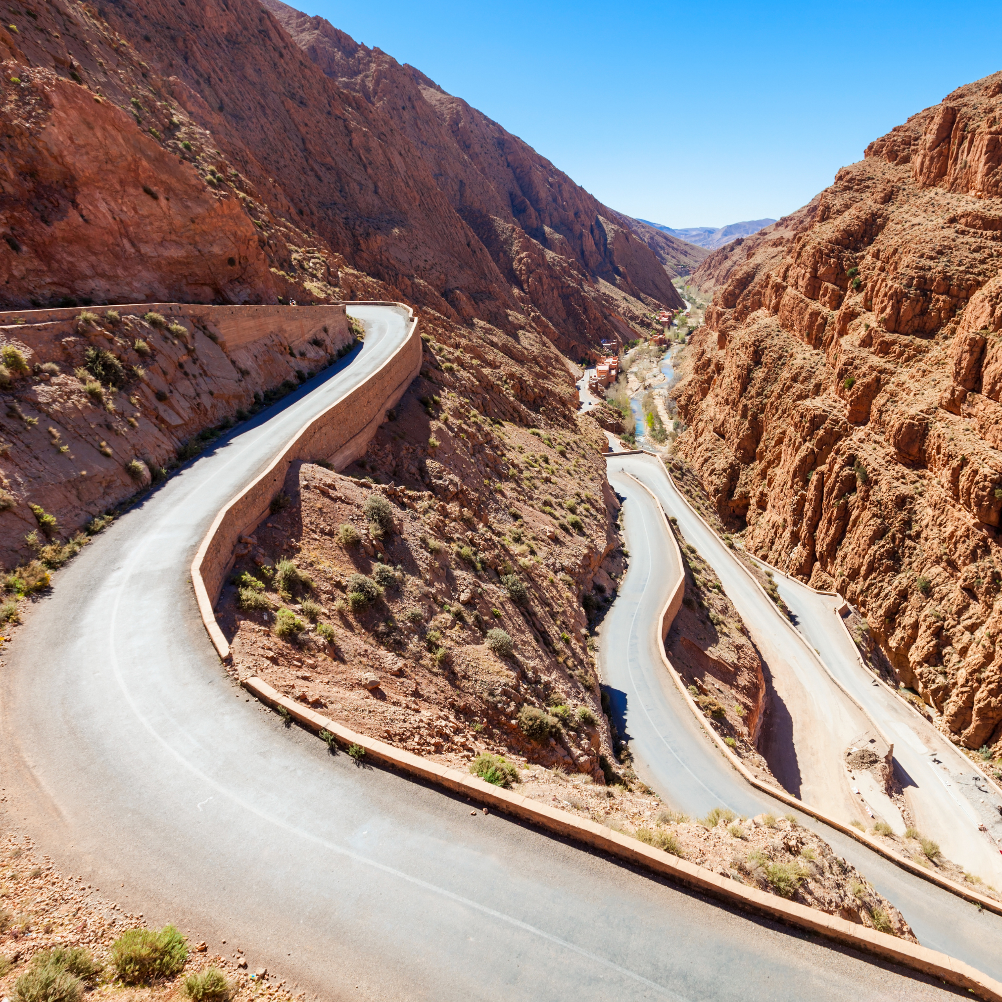 托德拉峡谷位于摩洛哥阿特拉斯山脉东部,是摩洛哥最壮丽的自然奇观之一。这条峡谷经过数千年河水的侵蚀,形成了两侧高达300米的巍峨峭壁,最窄处宽度不足20米,呈现出令人叹为观止的险峻景象。谷底河床上的柳树、花草与各种树木在微风中摇曳,勾勒出一幅青翠的自然画卷。而环绕四周的红棕色贫瘠山脉,则与河谷的繁茂绿意形成了强烈的视觉对比,构成了独特而迷人的景观。